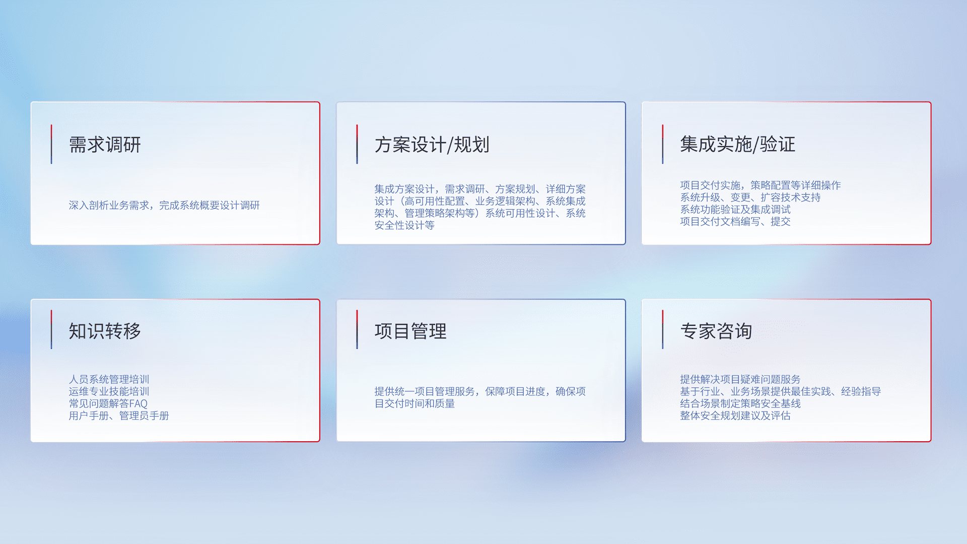 针对客户行业特性,,,将宏观的安全战略和需求,,,通过专业的交付服务,,实现项目落地,,为客户提供标准规范的集成交付服务。。。